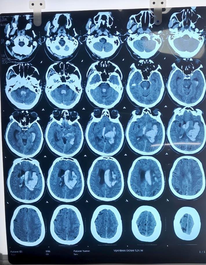 “At 2 AM, Mrs. P, a 51-year-old, collapsed while preparing tea. Her husband rushed her in — half her body limp, eyes half-open, speech slurred. The CT scan lit up with a deep red bloom in her brain — a hypertensive time bomb that had just gone off. There was no time for surgery; the fight would be won with precision, patience, and protocol. For three days, the ICU became her shield, every drip, every monitor, every elevated headrest part of the battle plan. Slowly, the swelling eased, the bleed settled, and the warrior within her brain quieted down.”